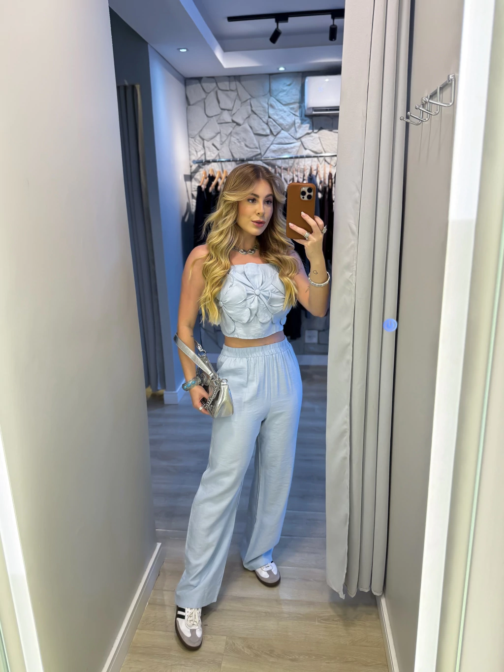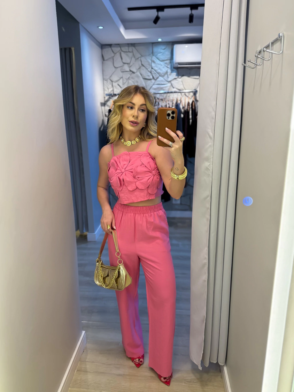 Conjunto de cropped com calça regulável, lastex nas costas e aplicações de flor frontal.