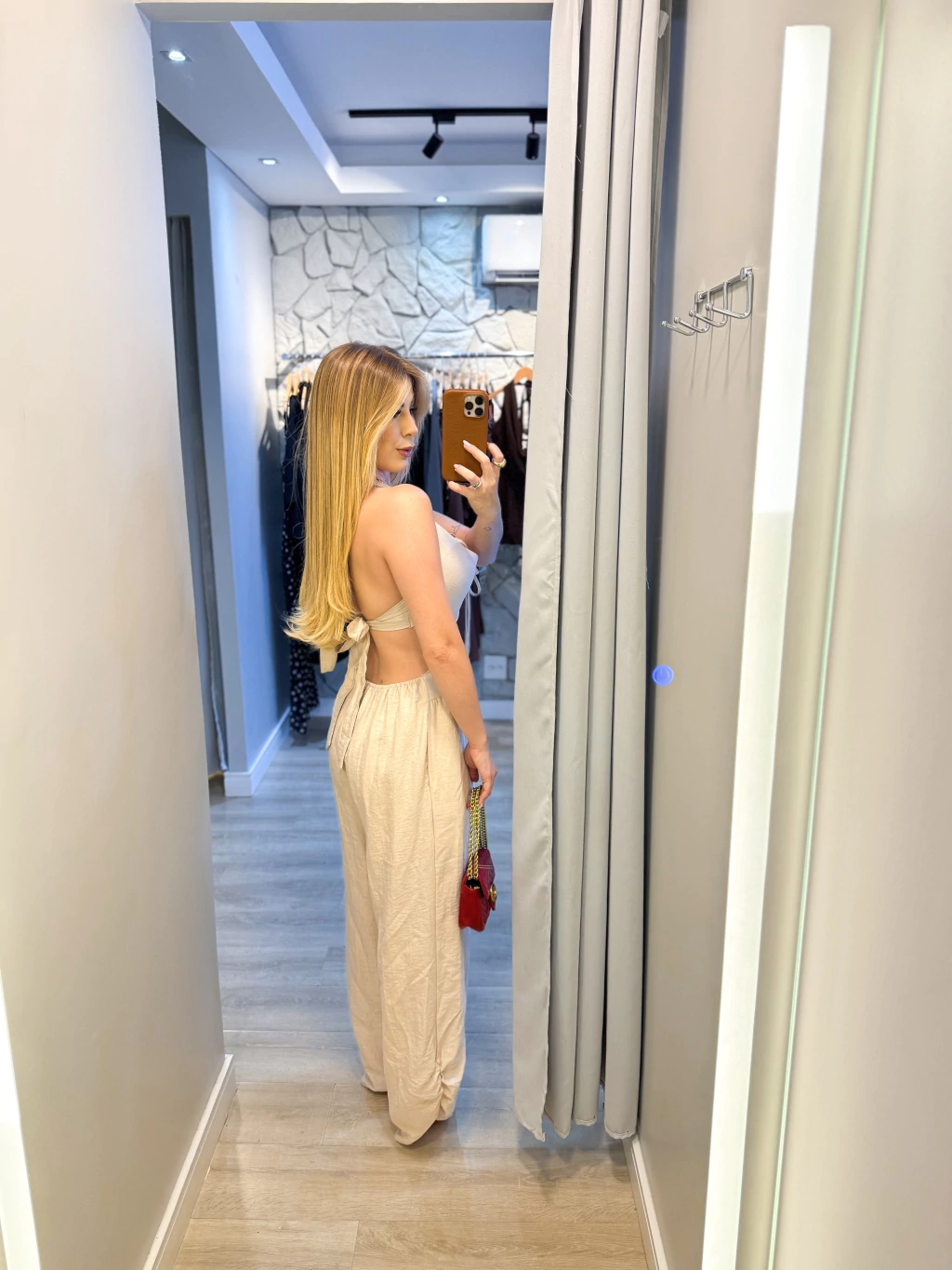 Possui elástico na cintura na parte das costas e amarração costas e pescoço.