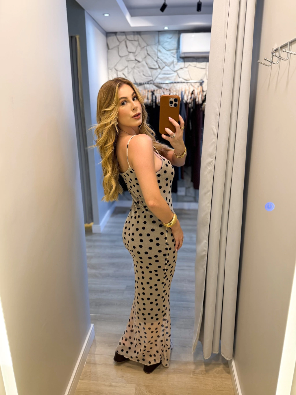 Vestido logo de tule. estampa póa. Forrado, modelagem mais reta com alça regulável.